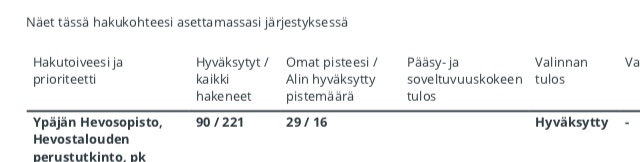 15.6 sain elämäni parahaimmat uutiset ikinä. Olin sillä hetkellä toisella rippileirilläni ja soitin äitilleni hädissäni, kun luulin, etten päässyt kolmeen ensimmäiseen hakuvaihtoehtooni, Ypäjälle, Kuhmoisiin tai Kerttuliin. Myöhemmin äiti kuitenkin sanoi saaneensa Kuhmoisista epävirallisen tiedon että pääsin Ypäjälle. Myöhemmin päivällä iskä vielä vahvisti asian laittaessaan kuvan Ypäjälle valituista opiskelijoista, ja nimeni oli listalla.